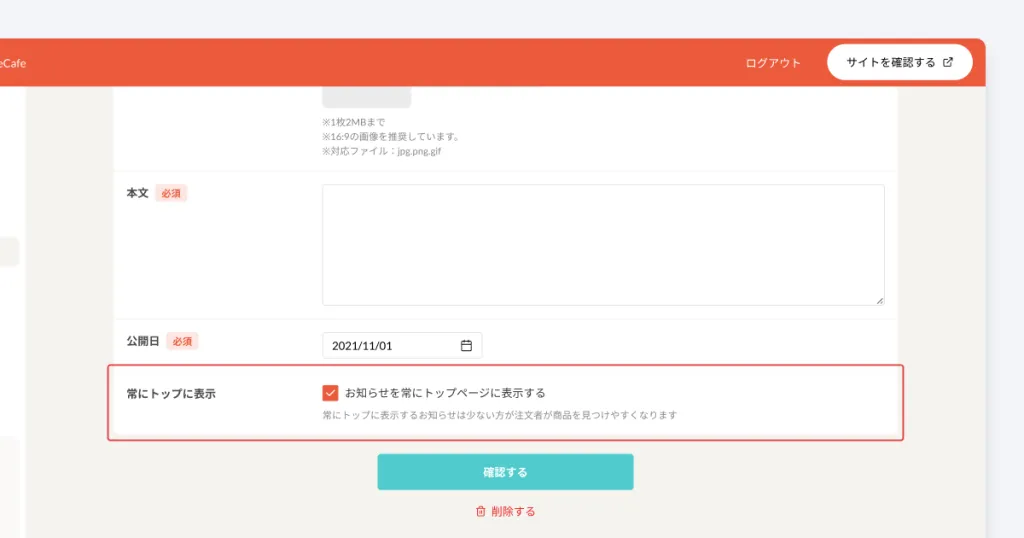 - お知らせを追加・編集する際に「お知らせを常にトップページに表示する」にチェックを入れることで、常にトップに表示することができます。