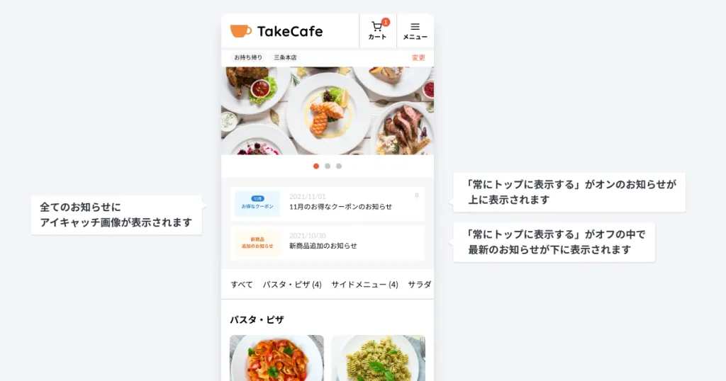 「常にトップに表示する」がオンのお知らせが複数ある場合は、公開日が新しい順に上から表示されます。
