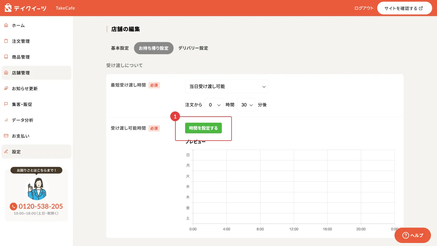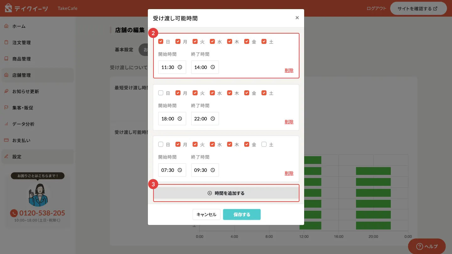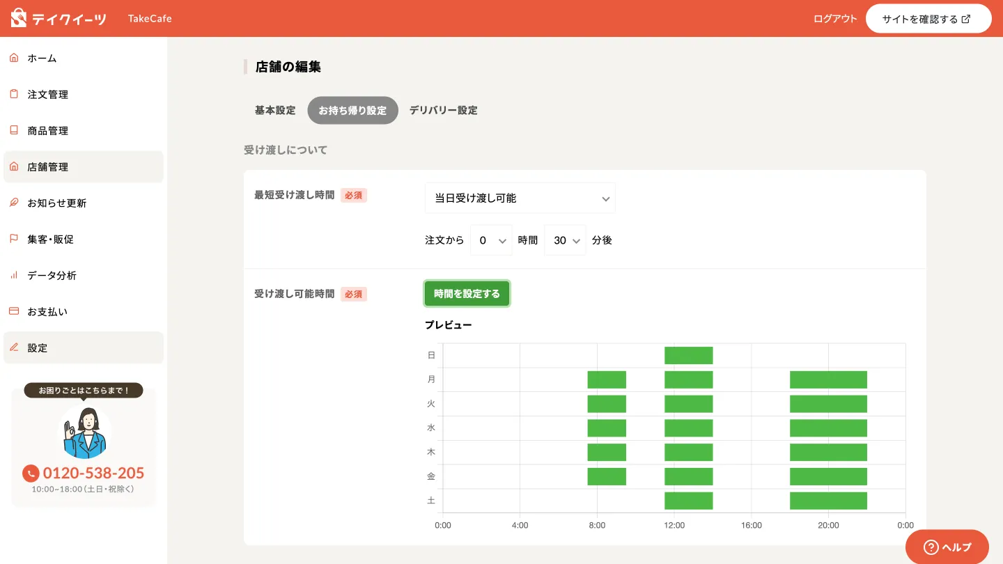 お客様が注文する際に、「商品の受け取り時間」として選べる時間を設定できる、店舗設定の項目です。多くのお店では店舗の営業時間としてご利用いただいています。