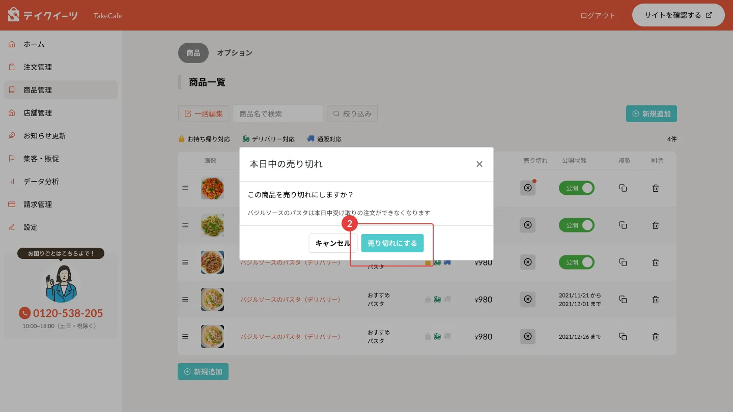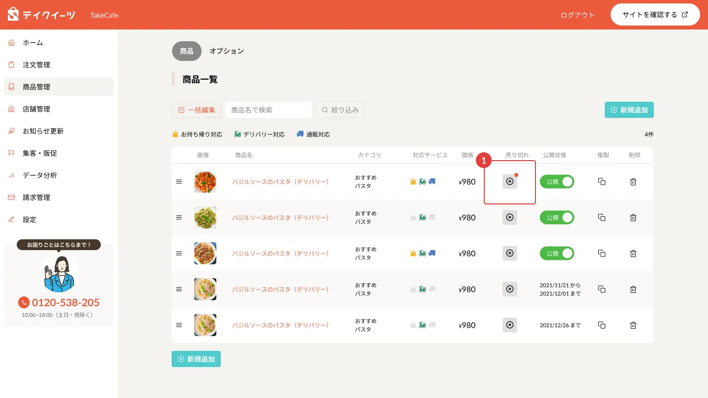 「売り切れにする」ボタンを押下すると商品に売り切れ設定が反映されます。