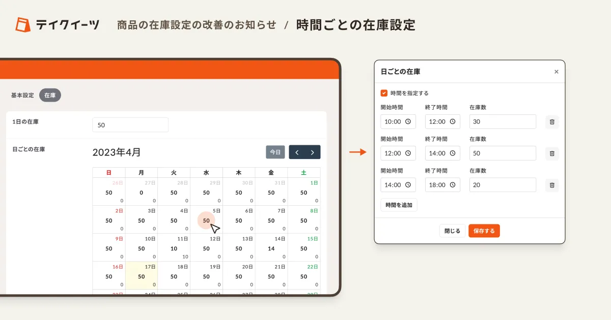 これまで「日ごとの在庫」ではその日を通しての在庫数を設定できましたが、これからは時間ごとの在庫数を設定できるようになります。
