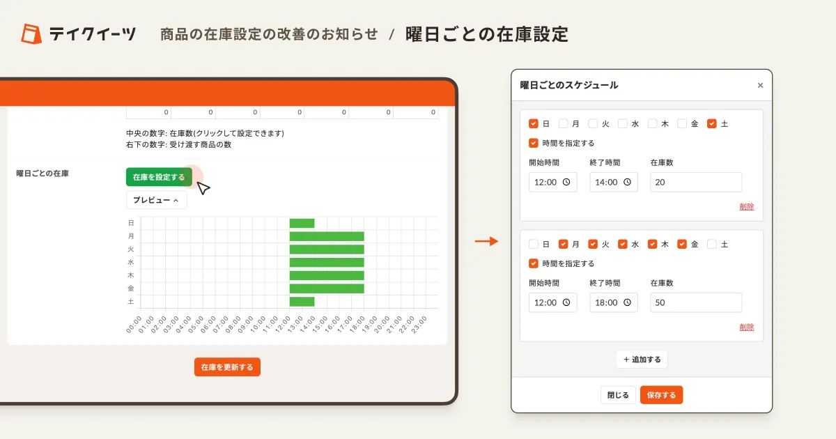 曜日ごとに販売できる個数が決まっている商品を取り扱う際に、一度設定した在庫数が毎週適用されるようになります。