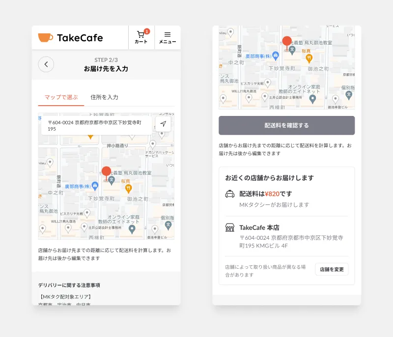 ユーザーがお届け先入力画面で住所を入力すると、近くの店舗が自動で選択されます。